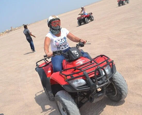 Он отвезет вас на станцию, где вы получите квадроцикл и проведете краткий инструктаж по его управлению, прежде чем вы начнете свое путешествие. Наш опытный гид будет сопровождать вас на протяжении всей поездки. Итак, вперед, ваши приключения в пустыне начинаются! Поездка на квадроцикле до деревни бедуинов занимает около 45 минут по суровому и впечатляющему пустынному ландшафту. В деревне вам расскажут несколько интересных фактов из жизни бедуинов, угостят настоящим бедуинским чаем и покатаются на верблюде .